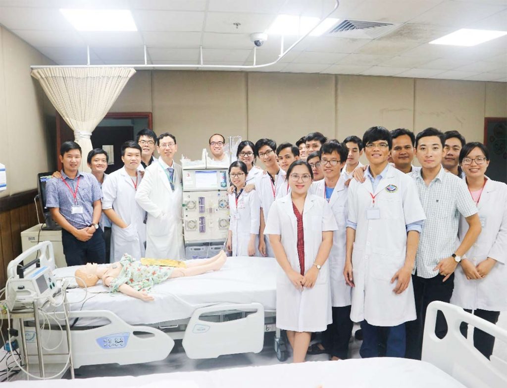 Chiều ngày 23/12, Các Học viên được hướng dẫn sử dụng và thao tác trên máy lọc máu, cũng như kỹ thuật lọc máu cơ bản, xác định đối tượng và liều lọc máu, các nguyên lý của lọc máu ngoài cơ thể và phương thức lọc máu ngoài cơ thể…. Các Học viên được chia thành nhóm, mỗi nhóm từ 04 – 05 học viên thảo luận các ca tình huống lâm sàng, thực tập trên máy lọc máu, trên mô hình mô phỏng lâm sàng (SimJunior) và hướng dẫn tại giường bệnh.
