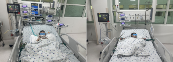 Tại đây ghi nhận: trẻ đừ, môi tím, khó thở, SpO2 85% được đặt nội khí quản, thở máy, chụp CT scan đầu ngực bụng ghi nhận: tràn khí dưới da vùng bụng, hông, lưng, ngực, cổ 2 bên, xẹp thùy trên phổi 2 bên và thùy giữa phổi (P). Mất liên tục thành khí quản cạnh gốc carina bên (P), theo dõi vỡ khí quản, tràn khí trung thất – gãy xương sườn 8, 9, 10. Không thấy khối choán chỗ trong hộp sọ.