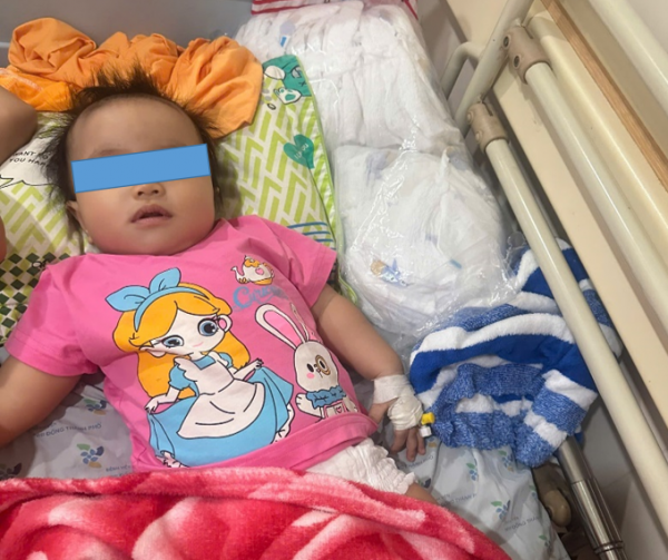 Tình trạng lúc nhập viện: Trẻ bứt rứt, quấy khóc, SpO2 87% – 92%, chi ấm, CRT < 2s, mạch quay đều rõ 148 l/p, tim đều rõ 148 l/p, thở co lõm ngực 52 l/p, thở rít thì hít vào, khàn giọng, phổi phế âm thô, phế âm đều 2 bên, bụng mềm, gan lách không to.