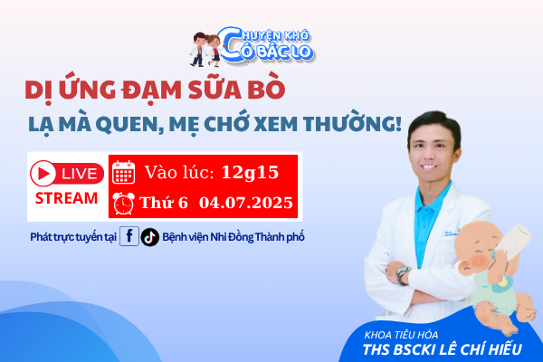 Nhằm cung cấp thông tin đầy đủ, chính xác và thiết thực về nhận biết – xử trí – chăm sóc trẻ bị dị ứng đạm sữa bò, Bệnh viện Nhi Đồng Thành Phố tổ chức buổi livestream tư vấn sức khỏe với chủ đề: “Dị Ứng Đạm Sữa Bò – Lạ Mà Quen, Mẹ Chớ Xem Thường” cùng ThS.BS Lê Chí Hiếu – Bác sĩ Khoa Tiêu hóa, có nhiều năm kinh nghiệm trong chẩn đoán và điều trị các bệnh lý dị ứng, tiêu hóa ở trẻ em, sẽ chia sẻ đến phụ huynh:
