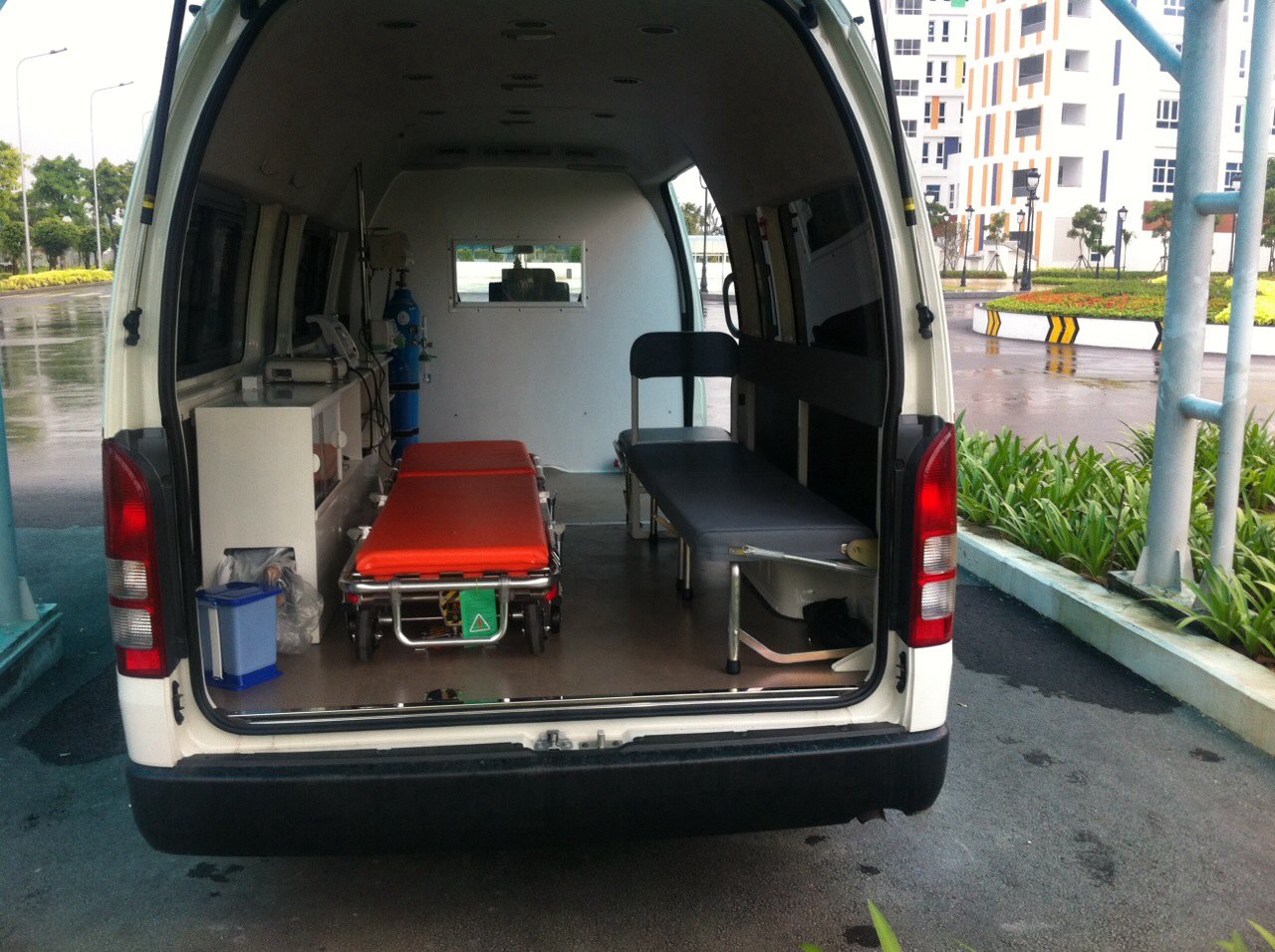 Nhằm mang lại sự an toàn cho người bệnh và đảm bảo quy trình chuyển viện cấp cứu, các xe cấp cứu (08 chiếc) được trang bị đầy đủ phương tiện, trang thiết bị y tế phục vụ cho bệnh nhân như bình oxy, máy thở, máy hút đàm, băng ca, túi cấp cứu.