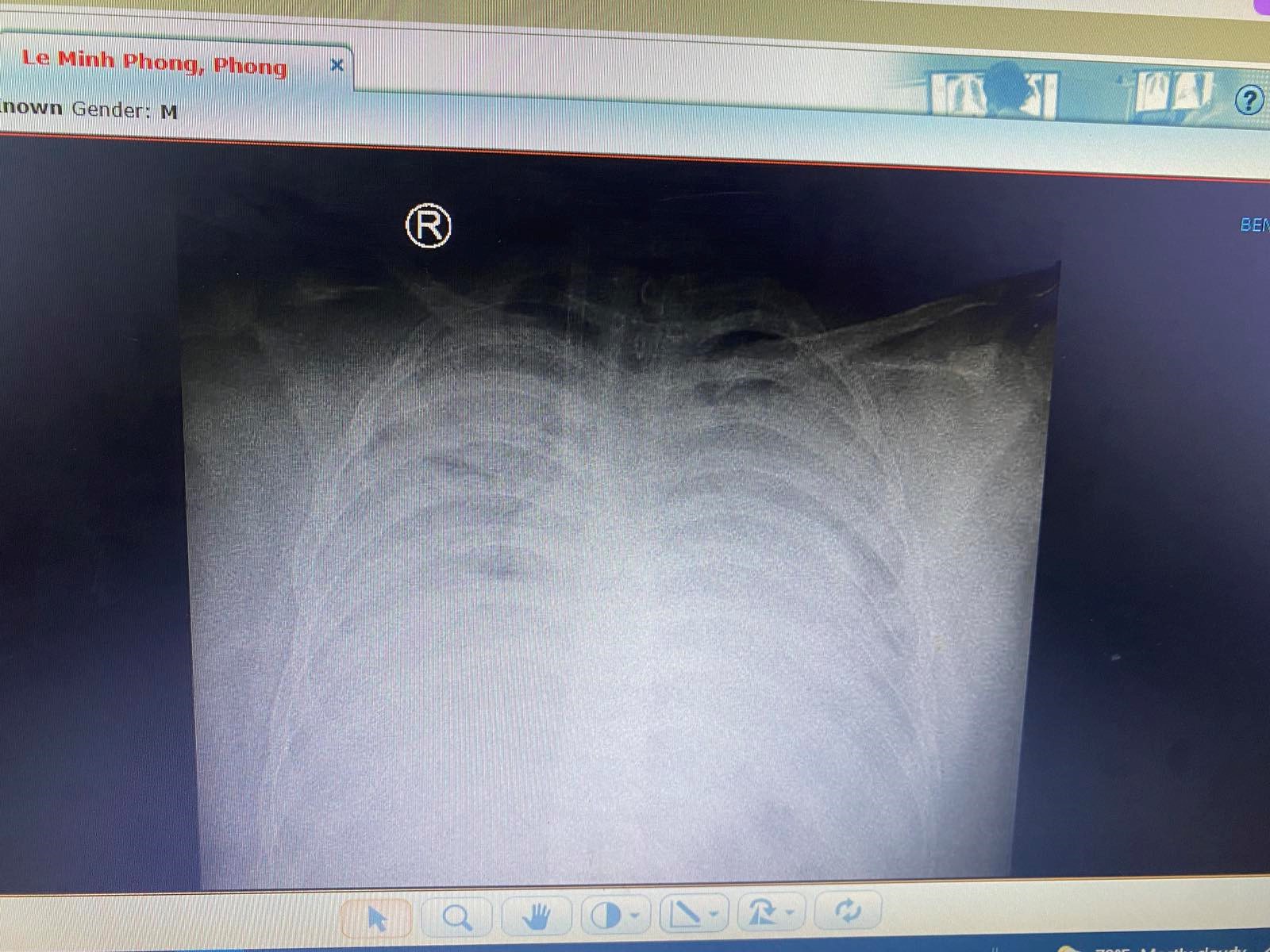 Xquang ngực cho thấy hình ảnh tổn thương thâm nhiễm phổi nặng lan tỏa 2 phế trường.