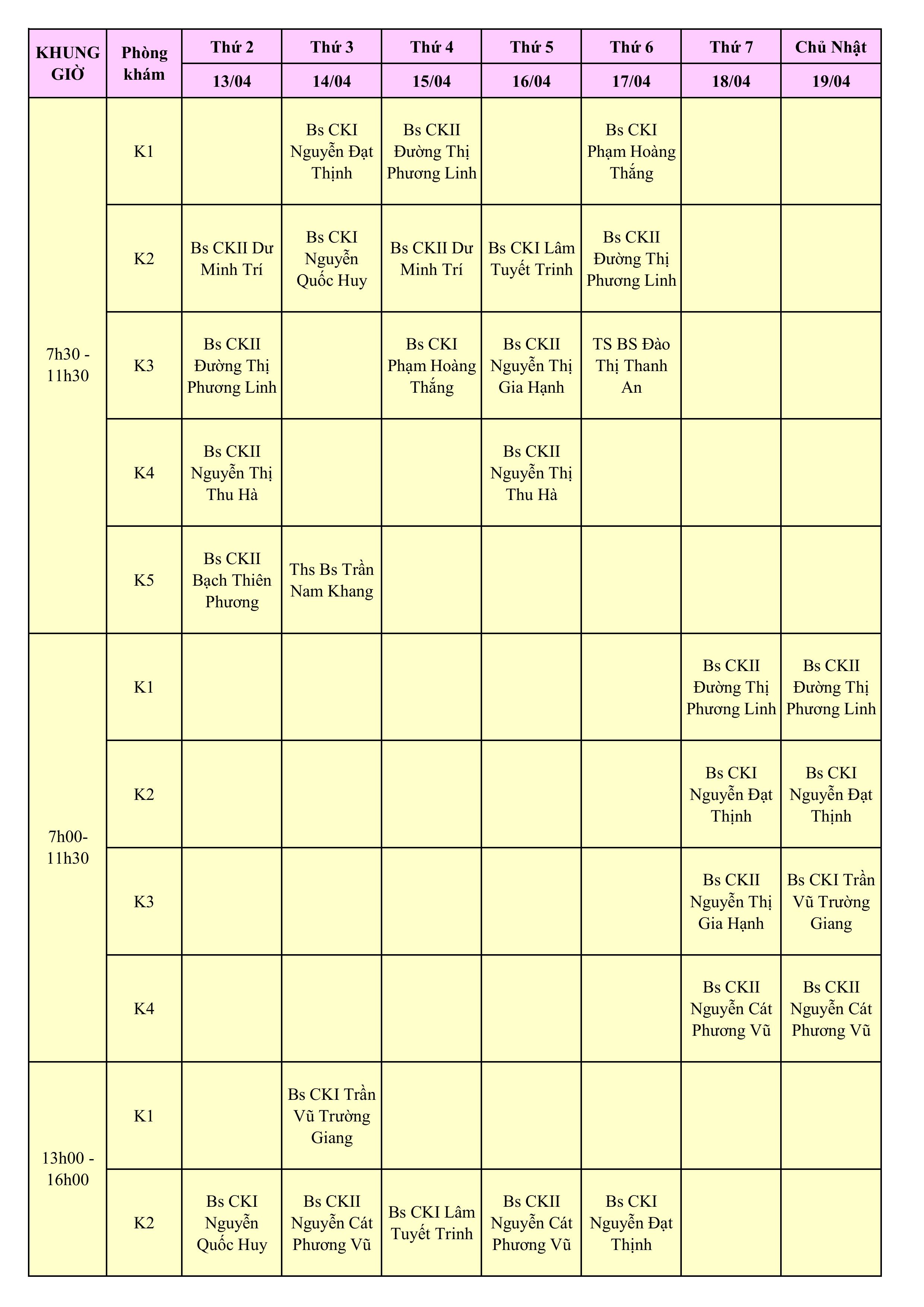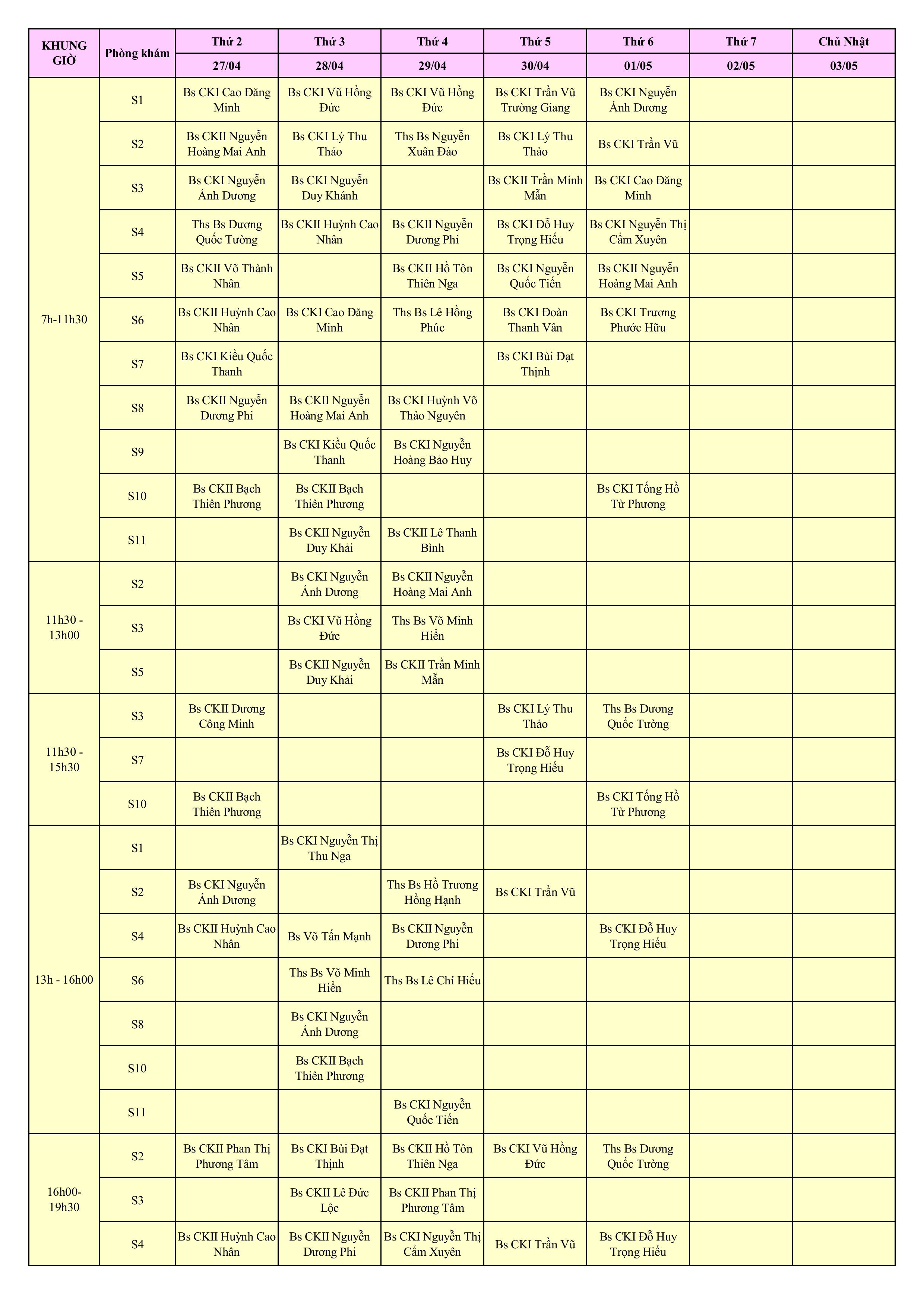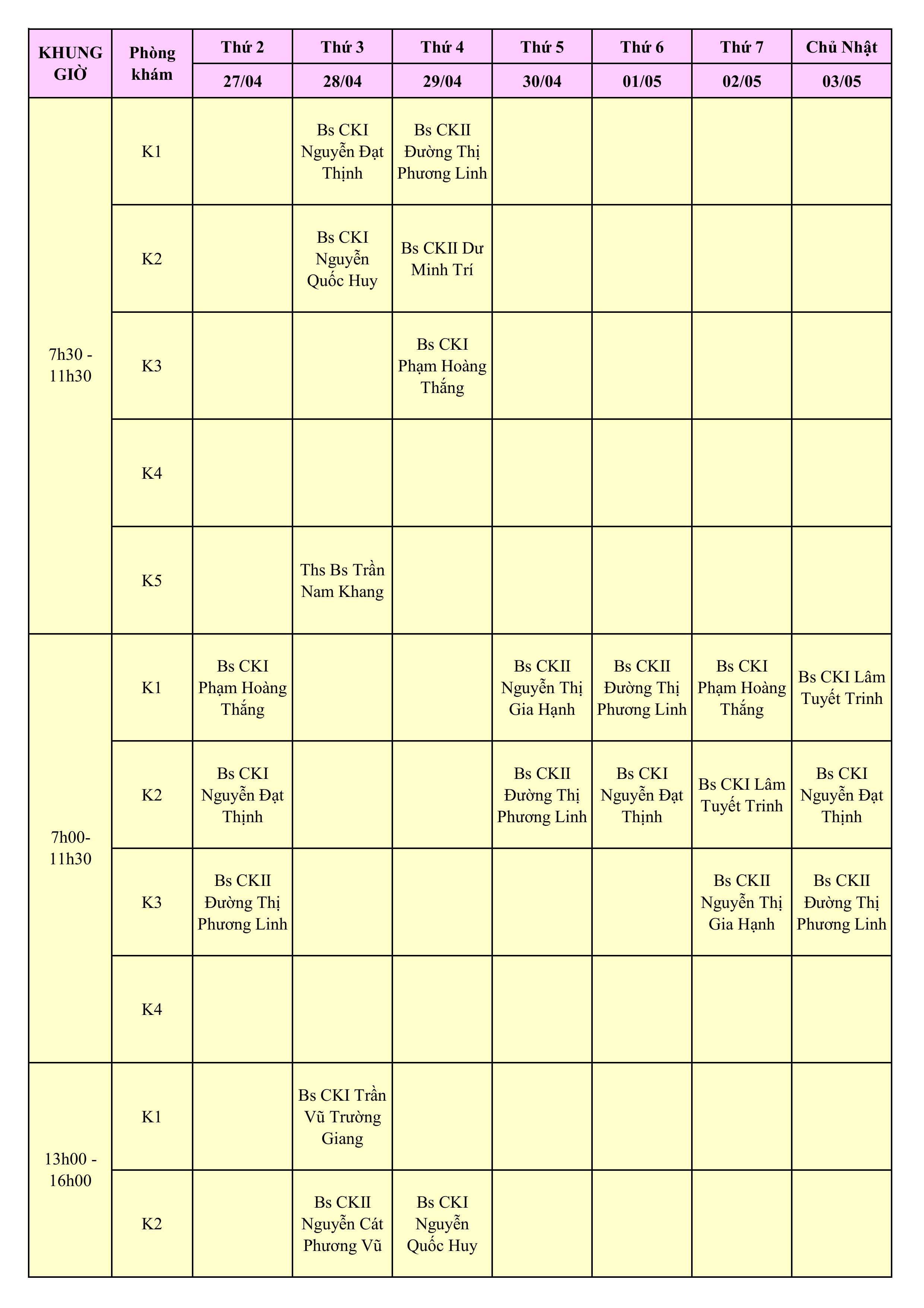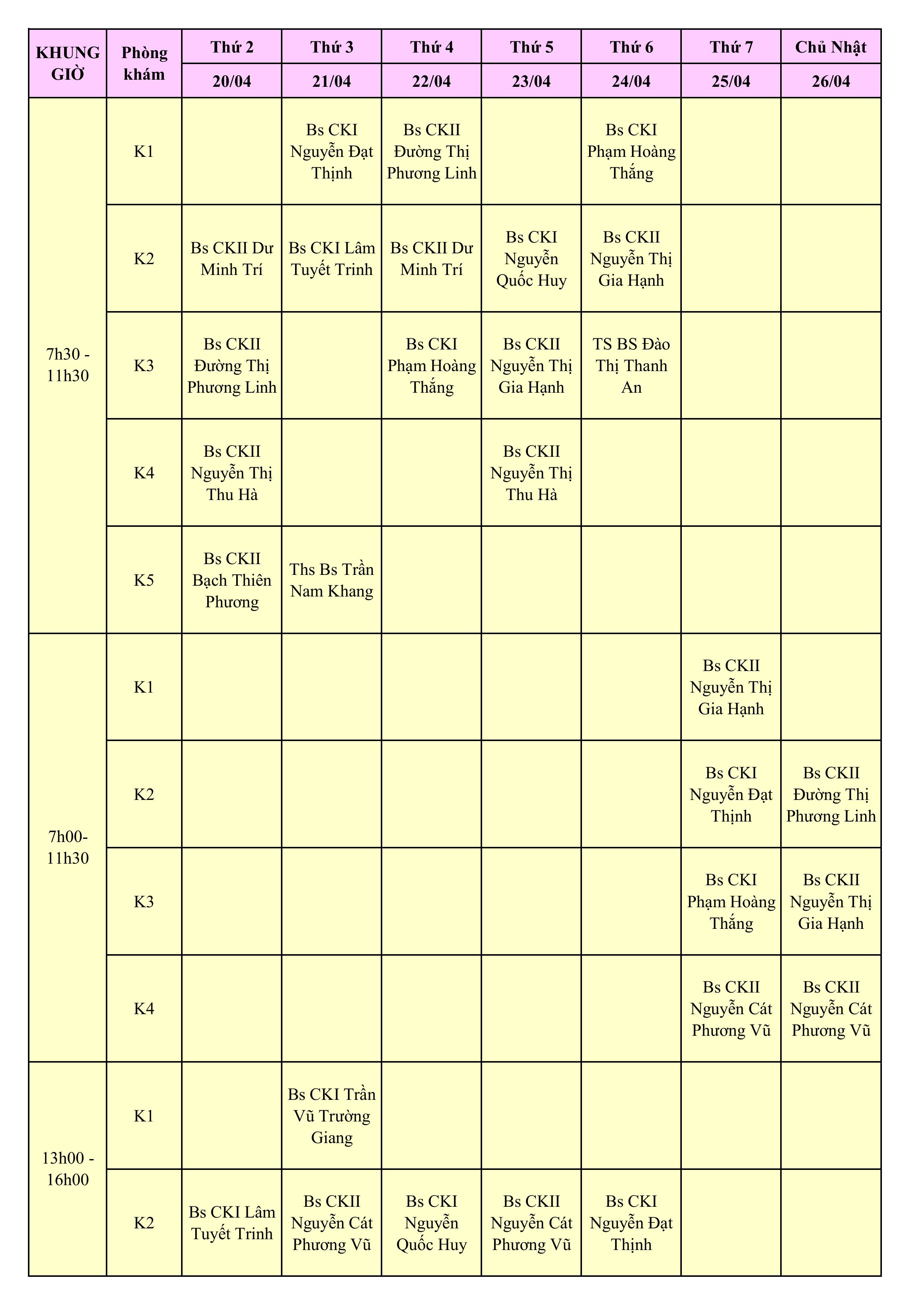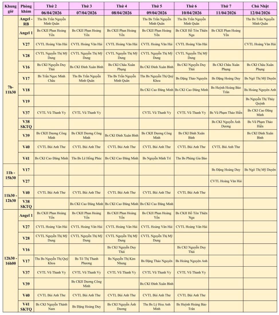 LỊCH PHÒNG KHÁM THÁNG 4/2026