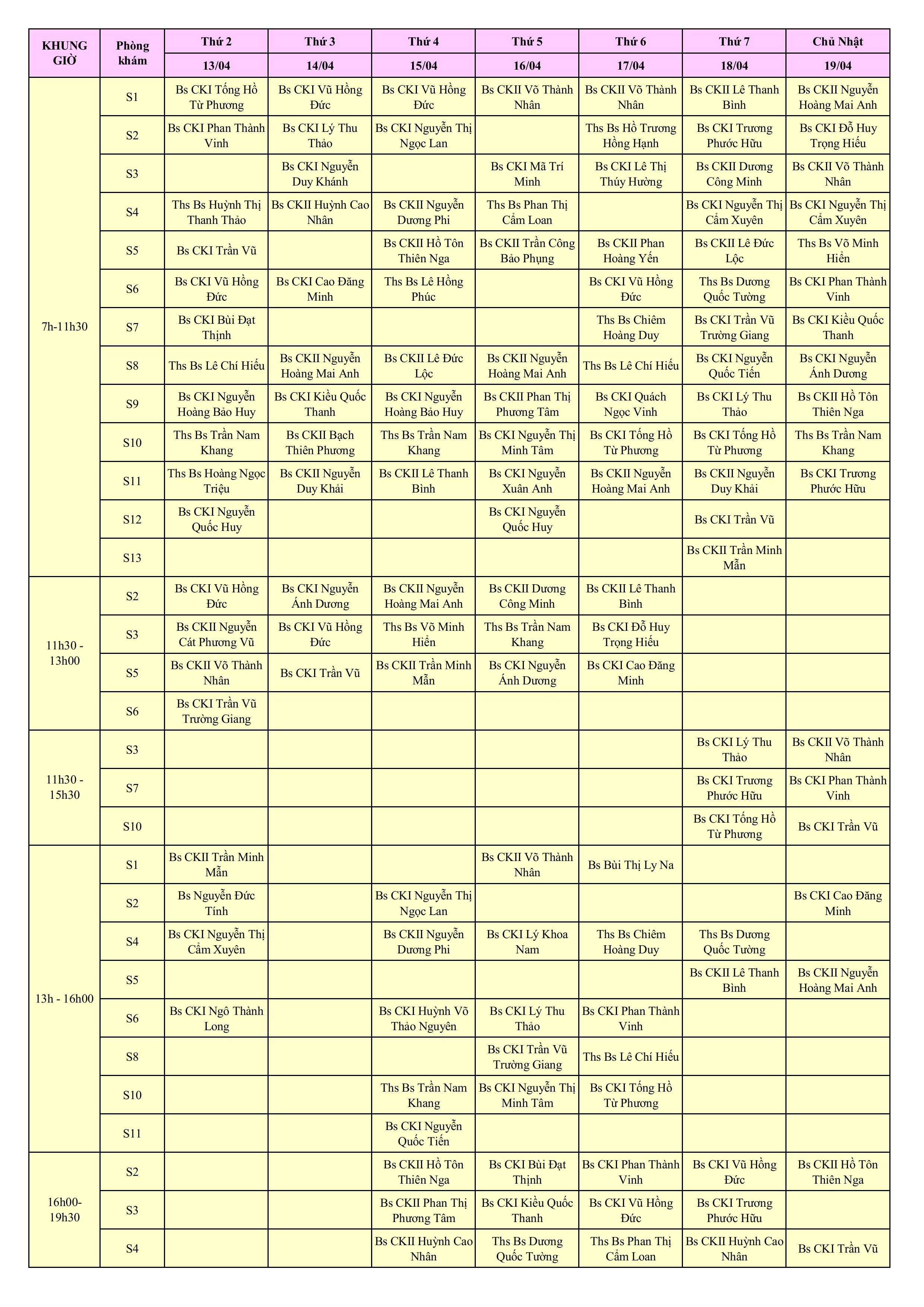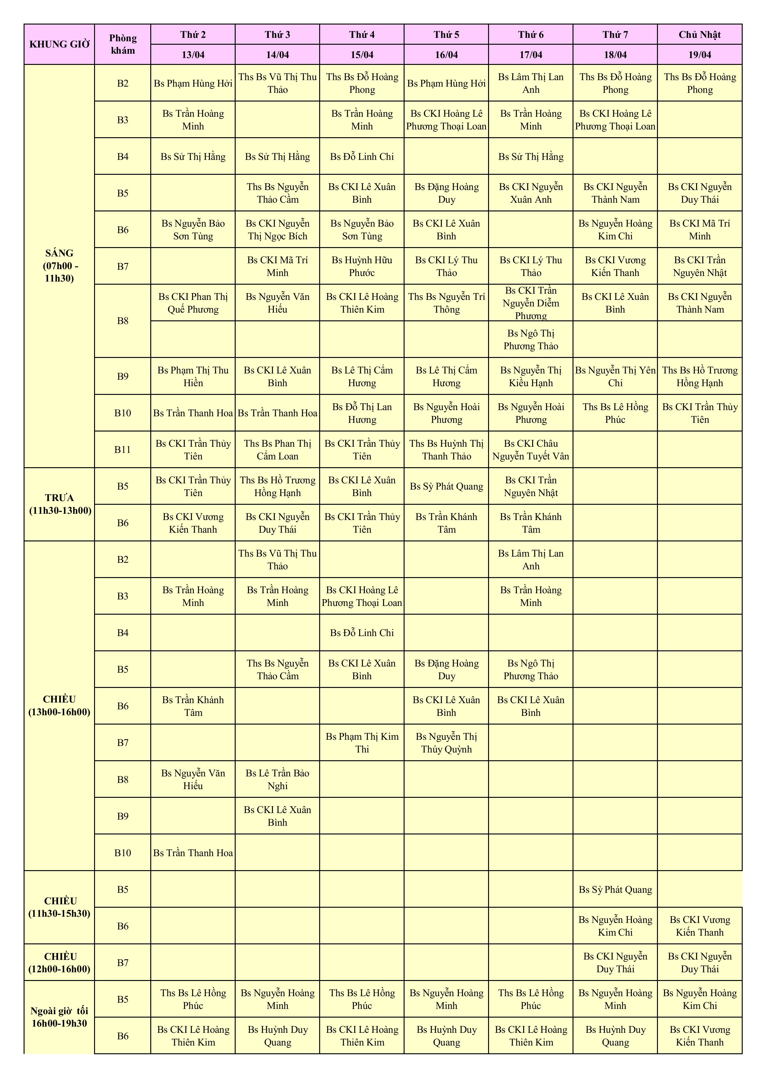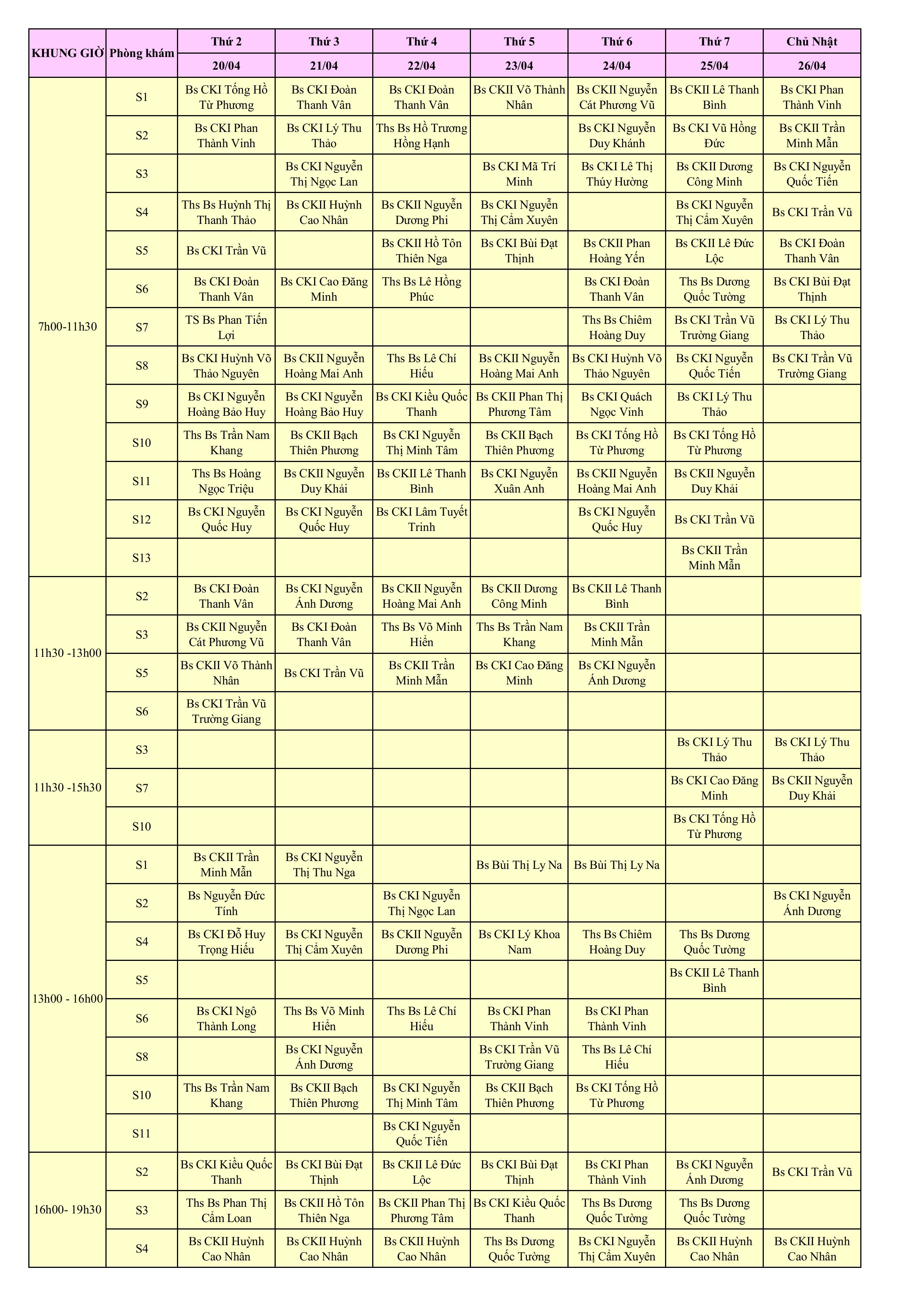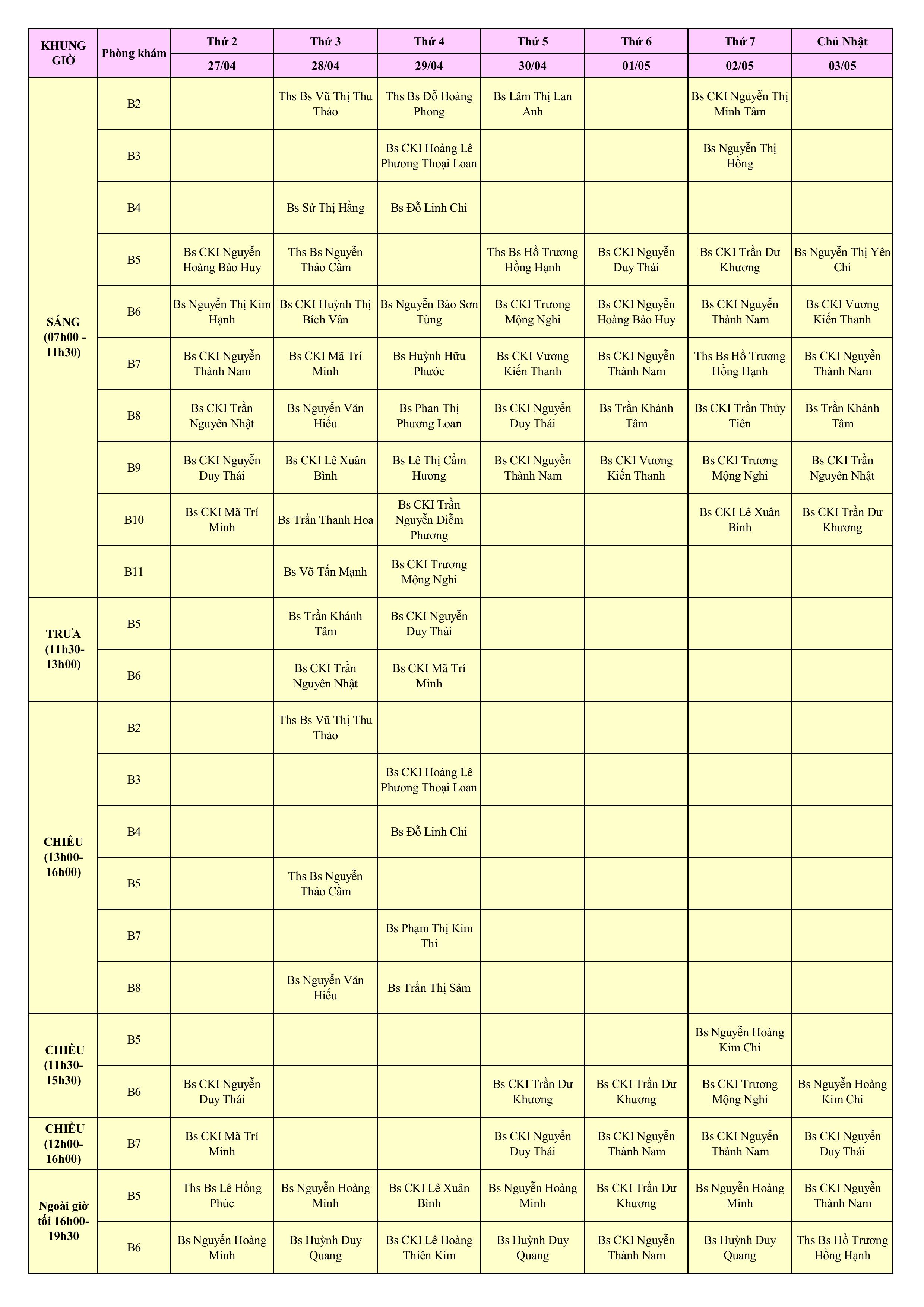 LỊCH PHÒNG KHÁM THÁNG 4/2026