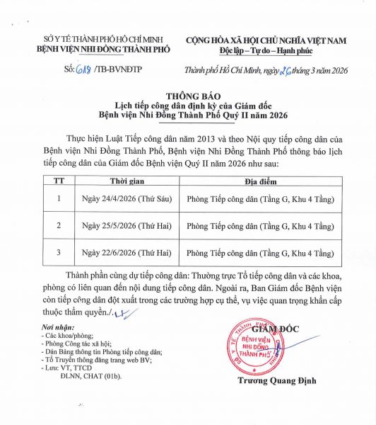 Lịch tiếp công dân định kỳ Bệnh viện Nhi Đồng Thành Phố Quý II năm 2026 30 Tháng Ba, 202625 Lượt xem Thông báo • Tin bệnh viện Bài viết liên quan Thông báo kết quả phỏng vấn kỳ tuyển dụng nhân sự Đợt 06, Quý II năm 2026 Tập san Thông tin Thuốc – Dược lâm sàng số 02.2025 Tập san Thông tin Thuốc – Dược lâm sàng số 01.2025 Lịch tiếp công dân định kỳ Bệnh viện Nhi Đồng Thành Phố Quý I năm 2026 Lịch tiếp công dân định kỳ Bệnh viện Nhi Đồng Thành Phố Quý IV năm 2025 Thông báo yêu cầu báo giá gói khám sức khỏe cho nhân viên y tế năm 2025 THỜI GIAN HOẠT ĐỘNG Tất cả các ngày kể cả lễ và cuối tuần Khám chữa bệnh 24/24 BẢNG GIÁ VIỆN PHÍ Tra cứu hóa đơn điện tử Danh mục kỹ thuật Thông tin tuyển dụng TIN DÀNH CHO CÁN BỘ Y TẾ Thông tin cần biết Bệnh Viện Nhi Đồng Thành Phố Bộ pháp điển Đường dây nóng 1900 - 9095