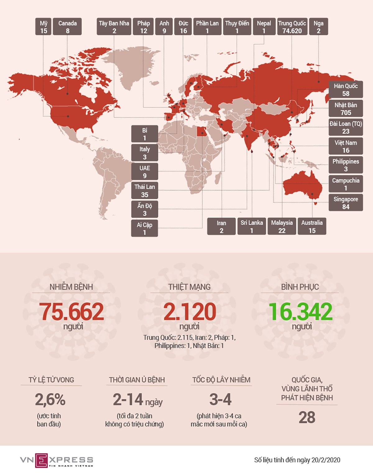 Trên toàn thế giới, 75.662 người nhiễm nCoV và 2.120 người chết. 16.342 người bình phục và 12.064 người trong tình trạng nguy kịch. Iran hôm qua phát hiện hai người nhiễm nCoV đầu tiên tại nước này và họ tử vong sau đó vài giờ. Tổng cộng 8 người chết vì nCoV được ghi nhận ở ngoài Trung Quốc đại lục, gồm Nhật Bản, Pháp, Philippines, Đài Loan, Hong Kong và Iran.