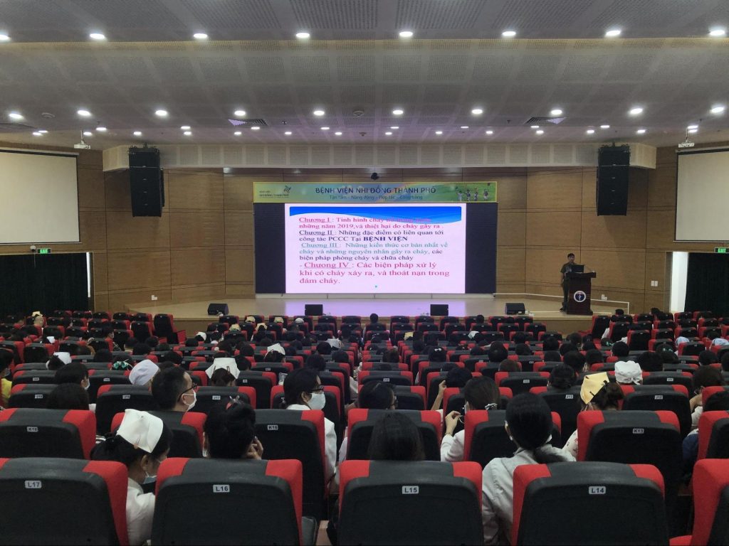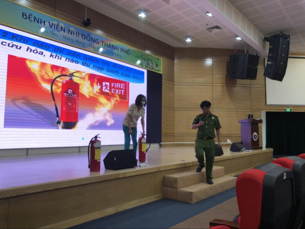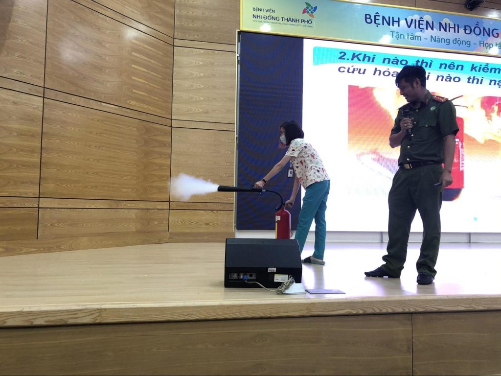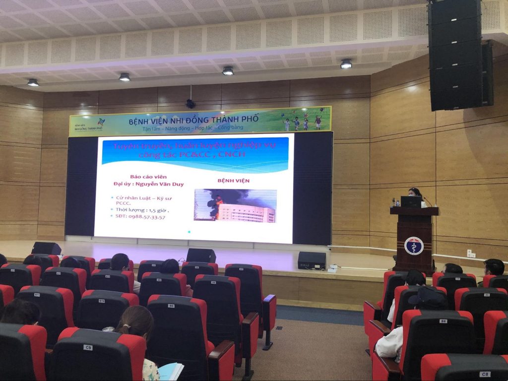 Bệnh viện Nhi Đồng Thành Phố đã phối hợp với Phòng cảnh sát phòng cháy chữa cháy và cứu nạn, cứu hộ (PCCC&CNCH) – Công an Thành phố Hồ Chí Minh tổ chức lớp tập huấn về lý thuyết an toàn phòng cháy chữa cháy và cứu nạn cứu hộ diễn ra trong 05 ngày cho hơn 1100 cán bộ, viên chức, người lao động đang làm việc tại Bệnh viện phổ biến về kiến thức chung về công tác phòng ngừa phòng cháy và chữa cháy, cách thoát nạn khi có sự số về cháy nổ xảy ra cũng như cách sử dụng các phương tiện chữa cháy hiện có tại Bệnh viện.