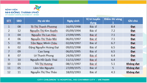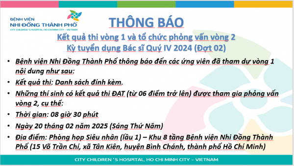 Thông báo kết quả thi vòng 1 và tổ chức phỏng vấn vòng 2 Kỳ tuyển dụng Bác sĩ Quý IV 2024 (Đợt 2) 17 Tháng Hai, 20251.599 Lượt xem Tuyển dụng Bài viết liên quan Thông báo Tuyển dụng nhân sự Quý I, năm 2026 (Đợt 2) Thông báo Tuyển dụng nhân sự Quý I, năm 2026 Thông báo Tuyển dụng nhân sự Quý IV, năm 2025 Thông báo Tuyển dụng nhân sự Quý IV, năm 2025 Thông báo Tuyển dụng nhân sự Quý IV, năm 2025 Thông báo Tuyển dụng nhân sự Đợt 01, Quý IV năm 2025 THỜI GIAN HOẠT ĐỘNG Tất cả các ngày kể cả lễ và cuối tuần Khám chữa bệnh 24/24 BẢNG GIÁ VIỆN PHÍ Tra cứu hóa đơn điện tử Danh mục kỹ thuật Thông tin tuyển dụng TIN DÀNH CHO CÁN BỘ Y TẾ Thông tin cần biết Bệnh Viện Nhi Đồng Thành Phố Bộ pháp điển Đường dây nóng 1900 - 9095