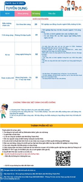 Thông báo Tuyển dụng nhân sự Đợt 01, Quý IV năm 2025 1 Tháng Mười, 20253.998 Lượt xem Tuyển dụng Bài viết liên quan Thông báo Tuyển dụng nhân sự Quý I, năm 2026 (Đợt 2) Thông báo Tuyển dụng nhân sự Quý I, năm 2026 Thông báo Tuyển dụng nhân sự Quý IV, năm 2025 Thông báo Tuyển dụng nhân sự Quý IV, năm 2025 Thông báo Tuyển dụng nhân sự Đợt 02, Quý I năm 2025 Thông báo Tuyển dụng nhân sự Đợt 02, Quý II năm 2025 THỜI GIAN HOẠT ĐỘNG Tất cả các ngày kể cả lễ và cuối tuần Khám chữa bệnh 24/24 BẢNG GIÁ VIỆN PHÍ Tra cứu hóa đơn điện tử Danh mục kỹ thuật Thông tin tuyển dụng TIN DÀNH CHO CÁN BỘ Y TẾ Thông tin cần biết Bệnh Viện Nhi Đồng Thành Phố Bộ pháp điển Đường dây nóng 1900 - 9095