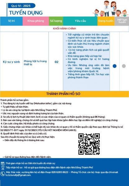 Thông báo Tuyển dụng nhân sự Quý IV, năm 2025 2 Tháng Mười Một, 20252.268 Lượt xem Tuyển dụng Bài viết liên quan Thông báo Tuyển dụng nhân sự Quý I, năm 2026 (Đợt 2) Thông báo Tuyển dụng nhân sự Quý I, năm 2026 Thông báo Tuyển dụng nhân sự Đợt 01, Quý IV năm 2025 Thông báo Tuyển dụng nhân sự Đợt 05, Quý III năm 2025 Thông báo Tuyển dụng nhân sự Đợt 02, Quý I năm 2025 Thông báo Tuyển dụng nhân sự Đợt 02, Quý II năm 2025 THỜI GIAN HOẠT ĐỘNG Tất cả các ngày kể cả lễ và cuối tuần Khám chữa bệnh 24/24 BẢNG GIÁ VIỆN PHÍ Tra cứu hóa đơn điện tử Danh mục kỹ thuật Thông tin tuyển dụng TIN DÀNH CHO CÁN BỘ Y TẾ Thông tin cần biết Bệnh Viện Nhi Đồng Thành Phố Bộ pháp điển Đường dây nóng 1900 - 9095