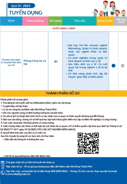Thông báo Tuyển dụng nhân sự Quý IV, năm 2025 1 Tháng Mười Một, 20252.528 Lượt xem Tuyển dụng Bài viết liên quan Thông báo Tuyển dụng nhân sự Quý I, năm 2026 (Đợt 2) Thông báo Tuyển dụng nhân sự Quý I, năm 2026 Thông báo Tuyển dụng nhân sự Quý IV, năm 2025 Thông báo Tuyển dụng nhân sự Đợt 05, Quý III năm 2025 Thông báo Tuyển dụng nhân sự Đợt 02, Quý I năm 2025 Thông báo Tuyển dụng nhân sự Đợt 02, Quý II năm 2025 THỜI GIAN HOẠT ĐỘNG Tất cả các ngày kể cả lễ và cuối tuần Khám chữa bệnh 24/24 BẢNG GIÁ VIỆN PHÍ Tra cứu hóa đơn điện tử Danh mục kỹ thuật Thông tin tuyển dụng TIN DÀNH CHO CÁN BỘ Y TẾ Thông tin cần biết Bệnh Viện Nhi Đồng Thành Phố Bộ pháp điển Đường dây nóng 1900 - 9095