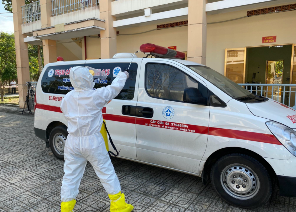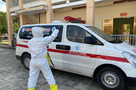 Khử trùng xe chuyển bệnh ngay sau khi bệnh nhân đã được chuyển vào phòng bệnh của BV dã chiến